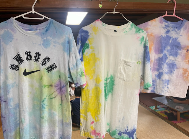 白いTシャツにアクリル絵の具を使って絞り染めする体験を企画しました。